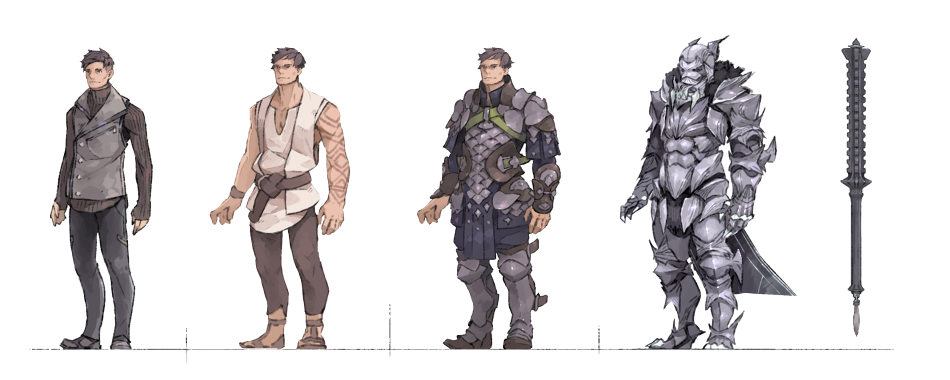 (left to right) Real-world Xavier, Thorn upon entry to Nova Terra, Thorn upon purchasing armor, Thorn at end of Book 1